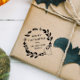 Cute Halloween stamp for your Halloween gifts and Halloween favors with Happy Halloween from your family written inside a wreath of greenery, a ghost, and cute bats.