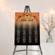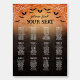 Spooky bat and spider web themed Halloween wedding seating chart sign in black and orange with flying bats and spider webs framing your seating chart with twelve tables.
