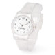 I only have one complaint. I ordered the watch with clear case and strap, and what was sent was white case and strap. I'm going to keep it because 1) it looks very nice in white, and 2) it would take too long to get a replacement made and sent in time for my occasion. Aside from the mix up with the color, the watch does look very good in white. The purple dial is actually sparkly which did not show in the online images. That was a nice surprise. If you like Swatch watches this is very similar to those. It's 33.6mm in diameter, 10.5mm thick, and 40.6mm lug to lug. Stainless steel case back says 3ATM/30m WR, so no swimming or showering or submerging this one. If you like Woodstock, this is a great choice.