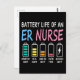 Humorous shift chart showing the battery life of an ER nurse with colorful levels from start to double shift. Ideal for emergency nurses who enjoy relatable workplace humor.