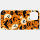 This vibrant Halloween-themed design features a playful pattern of black pumpkins and bats on a bright orange background. The pumpkins have classic jack-o'-lantern faces with glowing eyes and triangular noses, while the bats swoop playfully around them. The design is perfect for Halloween-themed products like phone cases, stationery, or fabric. It evokes a fun and festive atmosphere, capturing the spirit of the spooky season.