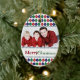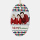 Oval Christmas tree photo ornament with red, green and blue bauble pattern and "Merry Christmas" text to personalize with your own photo and text.