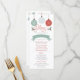 Pretty snowflake crested Christmas holiday baubles in mint green, light gray and dusky red are the focus of this wedding reception menu design which also features a banner for the bride and groom's names with the details below. The appetizers and signature drinks menu is on front and the full dinner menu is continued on back with holly boughs at the top and bottom opposite corners.