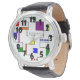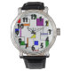 This men's watch has a Bauhaus design of lines going vertically and horizontally to make a grid with squares, rectangles, triangles, and circles placed around the grid. If you like the design but prefer different colors, message me.