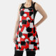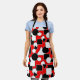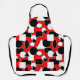 This apron has a Bauhaus design of triangles, circles, rectangles, and pentagons in black and white on a field of red.