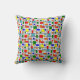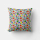 This throw pillow has a Bauhaus design of a grid with squares and rectangles in red, green, blue, orange, light blue, yellow, and red.