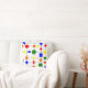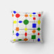 This throw pillow has a Bauhaus design of a grid with shapes in red, yellow, orange, green, and blue plotted on it.