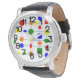 This men's watch has a Bauhaus design of a grid with shapes in red, yellow, orange, green, and blue plotted on it.