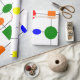 This wrapping paper has a Bauhaus design of a grid with shapes in red, yellow, orange, green, and blue plotted on it.