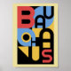 A vibrant, minimalist poster featuring the word "BAUHAUS" broken into geometric blocks. It utilizes a primary color palette of red, blue, and yellow against a black-and-cream background, emphasizing bold sans-serif typography and modular shapes.