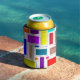 This can cooler has a Bauhaus design of rectangles in many colors with their black outlines offset.