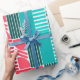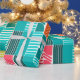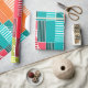 This wrapping paper has a Bauhaus-inspired design of shapes and lines in different shades of mid-century modern colors.