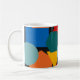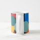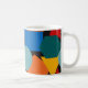 This mug has a Bauhaus design of random shapes in blue, teal, yellow, red, and orange.