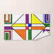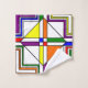 This towel set has a Bauhaus design of lines, triangles, diamonds, and squares making a stained glass look in primary and secondary colors.
