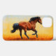 Bay wild mustang horse running across a dry grassy field. Realistic artwork created from an original oil painting by equine and wildlife artist Crista S. Forest.