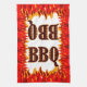 A hand towel reading BBQ in a western flaming font for cooks and cookout chefs. With graphic art of red and orange flames at the bottom of the design.