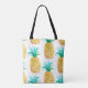 Bright and fun reversible pineapple tote bag. This decorative bag features a white background with a pineapple and the quote "Be A Pineapple - Stand Tall, Wear A Crown & Be Sweet On The Inside" on the front and a multipattern of pineapples on the back.