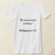 The Scripture on the t-shirt is quoted from the Christian Bible: Book of Philippians, Chapter four, Verse 6.
