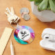 A keychain with the text: Be Awesome written inside a white circular frame. The background is a fancy artistic abstract design. Watercolor painting with the colors mixing and mingling creating a nice flowing layered marble look.