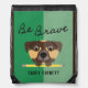 This Be Brave Drawstring Bag is for those who welcome adventure and bravery when faced with uncertainty. The design features a Mocha Brown Rottweiler dog holding a yellow pencil with a two-toned green shaded background. The simple cartoon graphic style of this book bag provides a modern look that is perfect in the classroom or at home. Add your name to make this bag your own. Be Brave!