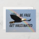 Be Free Get Vaccinated Flying American Bald Eagle personalized pro vaccination postcard features a flying American Bald Eagle.The text "Be Free" is above the eagle and "Get Vaccinated is below the eagle. The background shows a sky with a colorful rainbow. This pro vaccination political statement postcard is entirely customizable. You can change the images and the text and add your own. Look for more cool T-shirts, cards and gifts in our store at zazzle.com/VicesAndVerses.