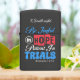 This black lighter features white stylized text that reads "BE Joyful IN HOPE, PATIENT IN Trials Romans 12:12". The words are arranged creatively with different fonts and sizes to emphasize the message. This design encourages joy and patience through faith, referencing the Bible verse Romans 12:12.