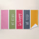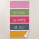 Color palette striped beach towel with positive quote. The wording reads "Be kind be happy be you!" and is lettered in handwritten script and whimsical typography. The design has 5 colored stripes in pink, green,, cerise, blue and yellow. A happy and cheerful design for the garden, pool or beach. Please browse my store for coordinating bags and outdoor pillows.