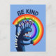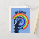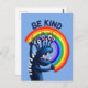 Kindness postcard with a funny character holding a rainbow and the text "Be Kind". Because we sometimes have to be reminded that just being a nice human makes the world little better.
