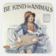 Vintage illustration of a young woman sitting on a bench, holding a dog wrapped in a blanket with the title "Be Kind to Animals" The illustration is by Morgan Dennis and was distributed by the State Humane Office of Madison Wisconsin