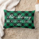 A festive green and black buffalo plaid lumbar pillow featuring elegant "Be Merry" script and a family name monogram. The bold diagonal check pattern and classic calligraphy create a warm, personalized Christmas accent. Customize with your family name for a meaningful holiday gift or seasonal statement piece. Perfect for sofas, entryways, and holiday bedding.