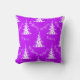 A colorful purple Christmas throw pillow featuring a pattern of modern Christmas trees in white against the purple background with the greeting 'Be Merry' repeated over it. This cushion would make a great decor item for your Christmas decorating this year.