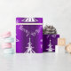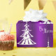 This festive, purple and white Christmas wrapping paper features a modern pattern of white Christmas trees, with the words 'Be Merry' scattered over a bright, colorful purple background.