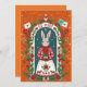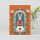 A whimsical Valentine card featuring a rabbit in a red heart-patterned sweater, holding a bouquet inside a decorative arch frame surrounded by vines, flowers, and envelopes reading Be Mine.