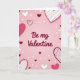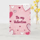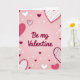 This Valentine's Day card features the words “Be my Valentine” in large, flowing maroon lettering placed right in the center. The background is a light pink that gets a little darker toward the edges, giving the card a soft, cozy look. Hearts are scattered all around the message in different sizes, so your eye keeps moving across the design. Some hearts are bright pink, some are deep burgundy, and others are white, which helps everything stand out. A few of the hearts have diagonal stripes in pink and white, adding a fun pattern without taking over the card. Tiny white and pale gray dots are sprinkled in like confetti, making the whole scene feel cheerful and sweet. A couple of the bigger hearts have gentle shading that makes them look like they’re floating slightly above the background 💘❤️. It’s an easy, loving way to share Valentine’s Day feelings with someone special 😘.