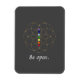 Seven channel Chakra line overlay on sacred geometry Seeds of Life symbol in gold. Charcoal gray background with white Be Open text.