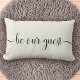 Modern trendy script calligraphy with flourishes reading "Be our guest" on this elegant black and ivory lumbar throw pillow, perfect to welcome guests to your home, vacation rental, or bed and breakfast.