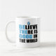 Believe there is good in the world - and let it begin with you. The inspirational text is printed in aqua and black and incorporates an image of the world dotting the 'i'. The side reads in small black text "...and let it begin with me".