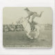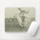 Bea Kirnan standing on the back of a running horse with only one leg. The horse seems to be in mid gallop and none of its legs are touching the ground.