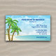 This magnetic business card features a tropical beach with palm trees. The water is a beautiful blue and there are clouds scattered in the sky. -