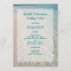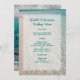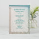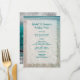 Beach wedding menu template. Tropical sand and sea background with two text templates in sea blue color. The title with the names of the couple is in larger script. The food served, from appetizers and drinks, to the wedding cake and candy bar, is listed in paragraph form. Another ocean water image covers the back of this 5x7 inch paper. The design is perfect for any wedding reception by the sea.