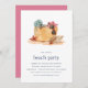 Chic beach party invitation is perfect for birthday parties or any beachy occasion! Summery design features a watercolor illustration of a beach bag nestled in the sand, with sunglasses, flip flops and seashells. Personalize with your beach party details in a chic mix of classic serif and modern sans serif typography.