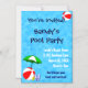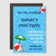 A custom pool or beach party invitation magnet template with a fun swimming pool theme, cool letters n blue and white, decorated with a red beach ball, green umbrella, sandals and suntan oil on a watery blue background with curly waves. Click Customize It to change fonts or colors, even save your design for later.