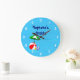 A custom clock with fun art of essential toys for the beach or the pool a red beach ball, green umbrella, sandals and suntan oil on a blue background with curly waves and optional white numbers. Click Customize It to change fonts, colors, even save your design for later.