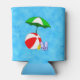Fun beach or swimming pool themed can cooler with red beach balls, green sun umbrellas, vacation sandals and suntan oil on a wavy blue background.