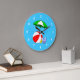 Fun art of essential toys for the beach or the pool; a red beach ball, green umbrella, sandals and suntan oil on a blue background with curly waves and optional white numbers. Click Customize It to add your name or message, even save your design for later.