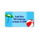 A custom address label with blue custom letters and fun beach or swimming pool themed art of a red beach ball, green sun umbrella on a watery blue background with curly waves. Customize It to change fonts, colors, elements, label size and more, even save your design for later.