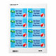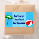 A custom label with blue letters and fun beach or swimming pool themed art of a red beach ball, green sun umbrella on a watery blue background with curly waves. This version reads "Don't forget your towel and sunscree" but you can change it to anything you wish, or delete for a blank label. Click Customize It to change fonts, elements, label size and more, even save your design for later.