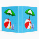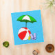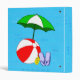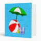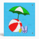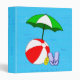 Fun beach or swimming pool themed art of a red beach ball, green sun umbrella, vacation sandals and suntan oil on a watery blue background with curly waves.
