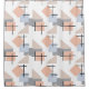 This shower curtain has a Bauhaus design of repeating rectangles, squares, diamonds, and triangles in beach colors of tan, grey, blue, and orange.