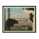Two Native Americans paddle their canoe across a lake, just offshore, on a foggy morning. A black bear sow is none too pleased and has sent her cub up a nearby birch tree for safety. Text reading, "WELCOME" also appears.